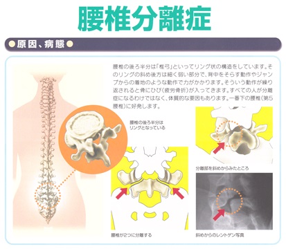背骨と背骨を繋げている椎間関節が疲労骨折によって折れて元に戻らないままになったものを分離症と言います。