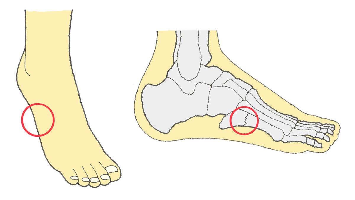 何らかの原因で脆くなった足部の第五中足骨の骨がランニングやステップ、ストップ動作の際に折れてしまい足部の外側に違和感を生じます。 ラグビーやサッカー、バスケットボール選手に好発すると言われています。