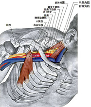 鎖骨周辺で神経や血管を圧迫する原因がいくつかあり、①前斜角筋(ぜんしゃかくきん)と中斜角筋(ちゅうしゃかくきん)という首の筋肉の間で圧迫されると斜角筋症候群、②鎖骨と第1肋骨の間で圧迫されると肋鎖(ろくさ)症候群、③小胸筋を通るときに圧迫されると小胸筋症候群、④頸椎(けいつい)にある余分な肋骨で圧迫されると頸肋(けいろく)症候群といいます。